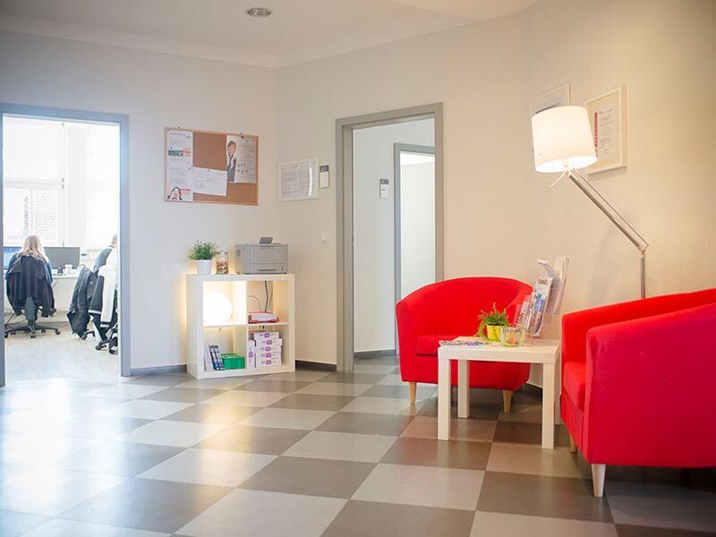 Das aufwändig renovierte hellblaue Haus mit roten Fensterrahmen erinnert an die klassischen Gebäude der Zwanzigerjahre. Ganz modern hingegen ist die Ausstattung der Schulungsräume, die im ersten und vierten Obergeschoss untergebracht und bei Bedarf auch per Fahrstuhl erreichbar sind. Hier findet der Unterricht zwischen 8 und 16:15 Uhr statt. Beim Blick aus den hohen Fenstern genießen Sie – je nach Etage – die Sicht auf die historischen Fassaden oder über die Dächer der Altstadt. In beiden Stockwerken steht Ihnen jeweils ein Pausenraum mit runden Tischen und bequemen Stühlen zum gemütlichen Beisammensein zur Verfügung. In der oberen Etage können Sie sich auch in der Lounge-Ecke mit Couch und Sesseln entspannen.