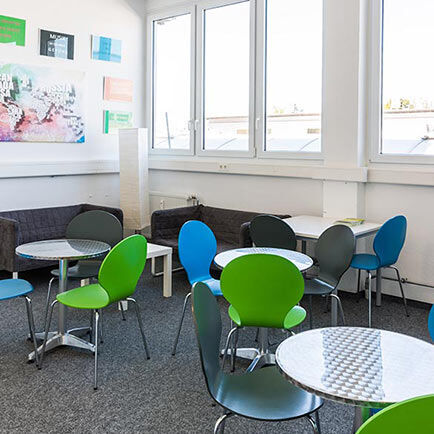 Die lichtdurchfluteten Schulungsräume befinden sich im ersten Stock und werden von einem Pausenraum mit kleinen Tischen und bunten Stühlen ergänzt. Wenn Sie sich eine kleine Stärkung holen oder zubereiten möchten, steht Ihnen die Küche mit Kaffeemaschine, Wasserkocher, Kühlschrank und Mikrowelle zur Verfügung. Ihre Unterrichtszeit liegt zwischen 8 und 16:15 Uhr.