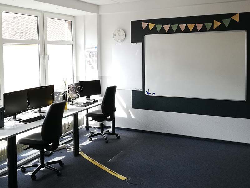Die Schulungsräume befinden sich in einem mehrstöckigen Gebäude, das Sie gut mit den öffentlichen Verkehrsmitteln und dem Auto erreichen. Im 1. und 2. Obergeschoss finden Sie die Schulungsräume. Sie erreichen diese über die Treppe oder dem Fahrstuhl. Die breite Fensterfront lässt viel Licht in die Räume und sorgt für eine freundliche Atmosphäre. Im Sommer schützen Außenjalousien vor übermäßiger Sonneneinstrahlung und gewährleistet angenehme Temperaturen zum Lernen. Das Team vor Ort berät Sie kompetent zu allen Fragen rund um Ihre Weiterbildung.
