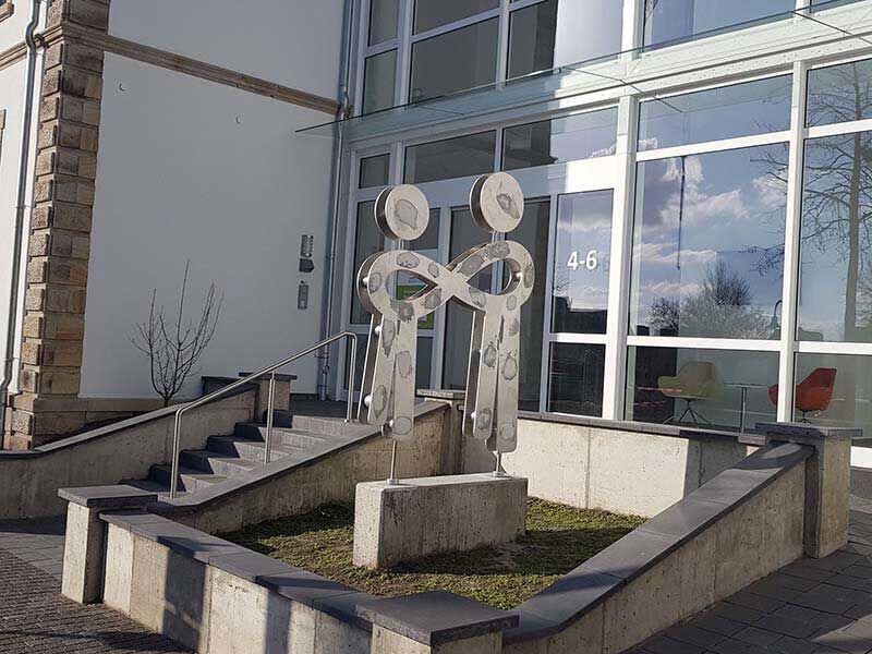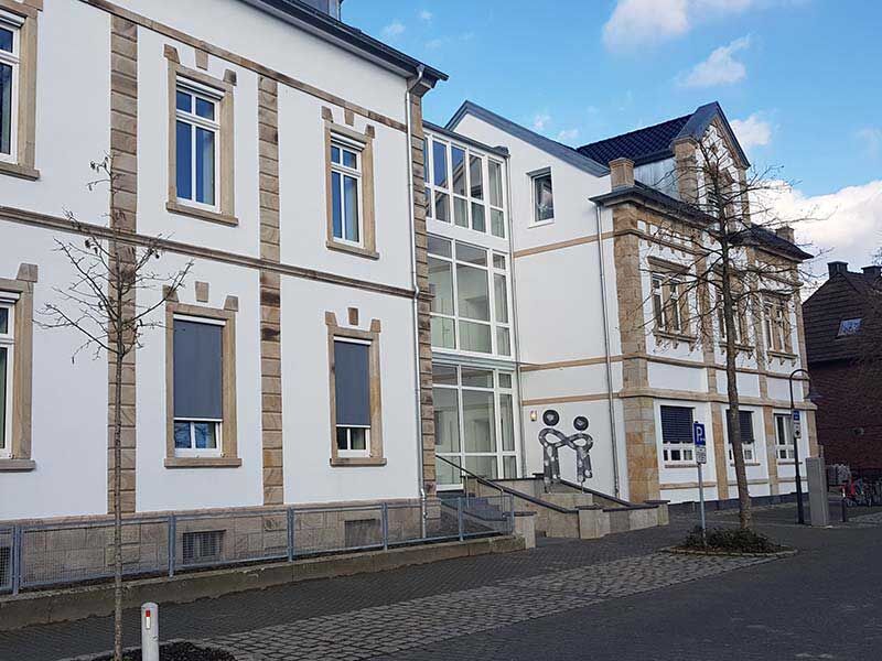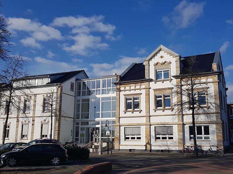 Der Ort für Ihre Weiterbildung ist der frühere Gebäudekomplex der Ibbenbürener Volkszeitung. Die im vorletzten Jahrhundert entstandenen Gebäude wurden aufwändig restauriert und mit einem Neubau zusammengeführt. Ihr Unterricht findet zwischen 8 und 16:15 Uhr im dritten Stock des Hauptgebäudes statt. Die Räume und Zugänge sind barrierefrei gestaltet. Ihr Schulungsraum ist liebevoll und gleichermaßen funktional eingerichtet. Viel Tageslicht und ein neuer PVC-Boden im Parkettstil sorgen für eine einladende Atmosphäre. Der Blick fällt direkt ins Grüne auf den Park. Neben den acht Arbeitsplätzen gibt es auch eine kleine Pausen-Ecke. In der zweiten Etage finden Sie außerdem einen schönen Aufenthaltsraum mit einem Kaffeeautomaten, einem Wasserspender und einer kleinen Teeküche.