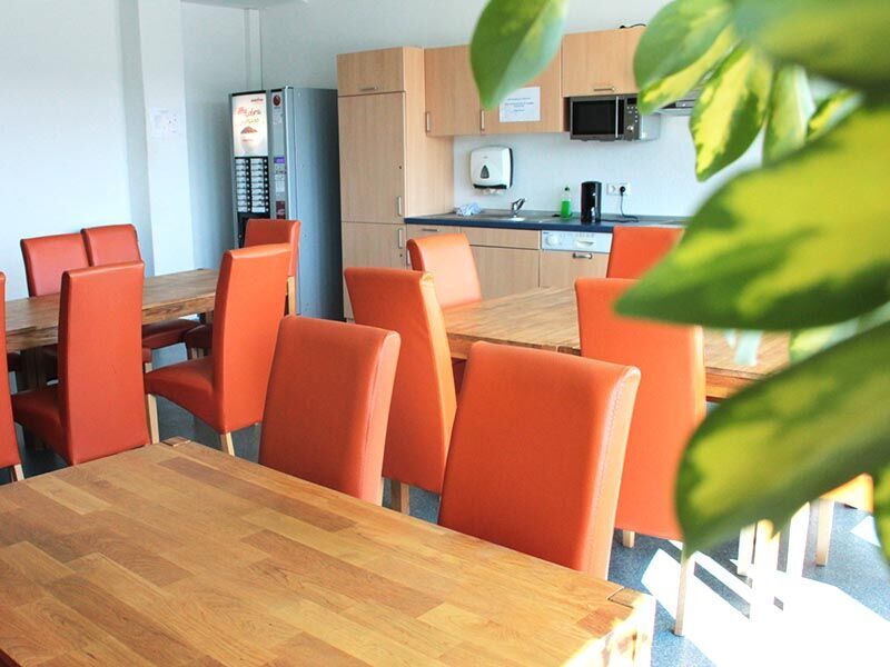 Die Schulungsräume in der vierten und fünften Etage sind mit dem Aufzug erreichbar und bieten von hier oben einen schönen Blick auf den Tollensesee. Der Unterricht findet hier zwischen 8 und 16:15 Uhr statt. Wem zwischendurch der Magen knurrt, der muss nicht weit laufen: Das Bistro im ersten Stock bietet Frühstück und Mittagessen an. Weitere gastronomische Angebote und Einkaufsmöglichkeiten gibt es im Umkreis von wenigen Gehminuten.