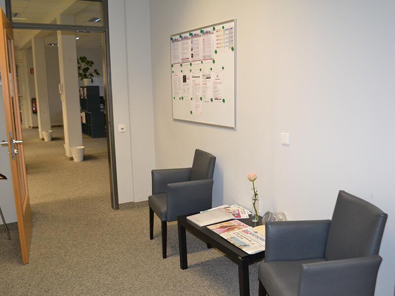 Die Räume befinden sich im Erdgeschoss des großen Bürokomplexes, der unter anderem auch die Agentur für Arbeit, das Finanzamt, den Zoll und die Bundeswehr beheimatet. Der Weg führt Sie durch einen Seiteneingang oder bei Bedarf auch stufenlos über den Hintereingang. Hell und großzügig mit hohen Decken und großen Fenstern präsentiert sich der Teilnehmerraum. Er wird von einer kleinen Küche ergänzt, in der Sie sich mit Kaffee oder Tee stärken können. Kleine Snacks können Sie im Kühlschrank lagern und in der Mikrowelle aufwärmen.