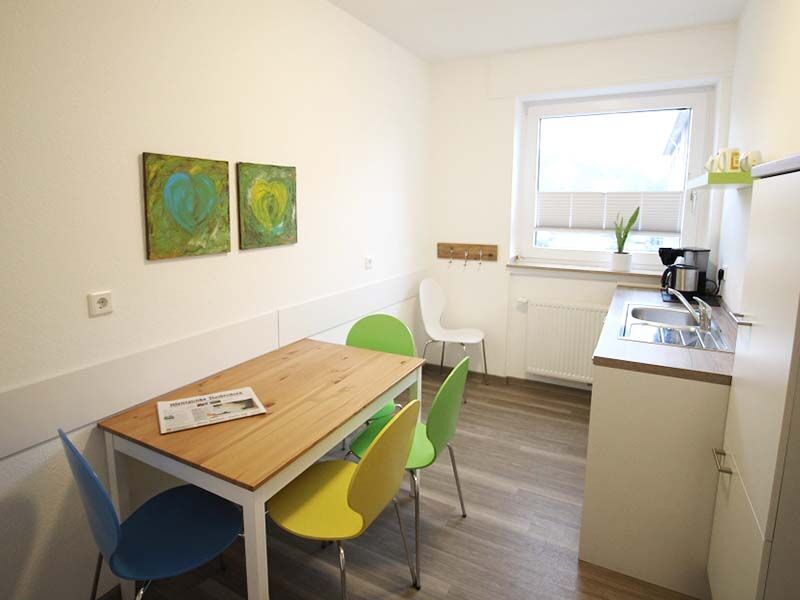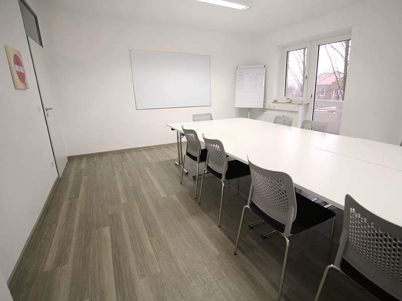 Die Umgebung am Ortsausgang des Stadtteils Burgsteinfurt liegt zwischen einer ruhigen Wohnsiedlung und der Tecklenburger Straße. Grünanlagen und alter Baumbestand sorgen für eine entspannte, ruhige Atmosphäre. Ihr Unterricht findet von 8 bis 16:15 Uhr im sogenannten Grünen Haus statt. Es wurde 2014 kernsaniert und barrierefrei umgestaltet. Die Schulungsräume präsentieren sich mit modernem PVC-Boden in Holzplanken-Optik, der Blick geht in die Gärten der angrenzenden Wohnsiedlung.