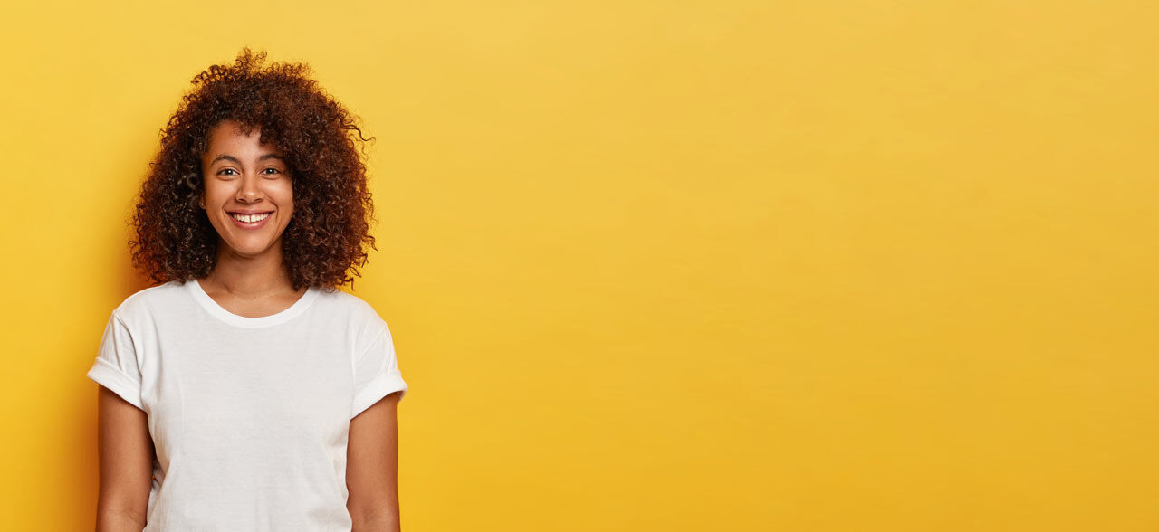 eine Frau mit einem Pferdeschwanz und einem gelben Hemd